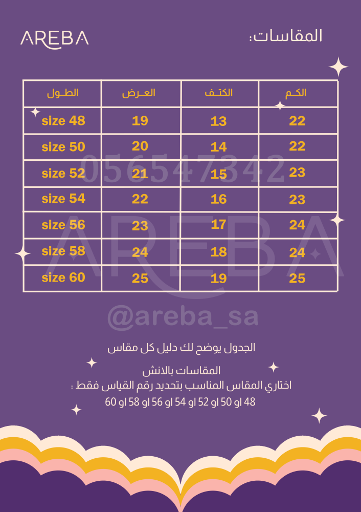 - مقاس المنتج: متاح مقاسات من ( 48 الى 60 )